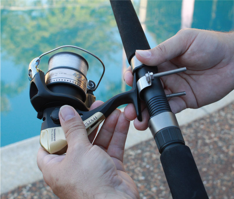 Remove reel from rod and attach Reel‑Ezy™ saddle with bolts attached at about the centre of where the reel will be.