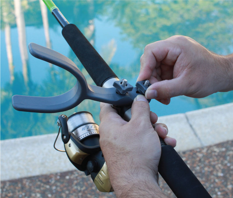 Fit Reel‑Ezy™ arm brace to rod on opposite side of reel handle as pictured and tighten the nuts.